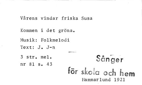 //// Vårens vindar friska Susa //// Kommen i det gröna. //// Musik: Folkmelodi Text: J. J-n //// 3 str. mel. //// ^ G n Q e r //// nr 81 s. 43 ^ //// for s^c*G och henn //// Hammarlund 1921