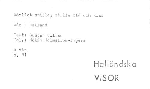 //// 'Jårligt stilla, stilla blA och klar //// Var i Halland //// Text: Gustaf Ullman //// Mel,: Malin Holmstrom-Ingers //// 4 str. s. 31 //// ViSOR