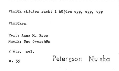 //// V&rlök skjuter raskt i höjden opp, opp, opp Vå-rlSken. //// Text: Anna M. Roos Musik: Uno 8vers*M5m //// 2str. mel. //// s. 55