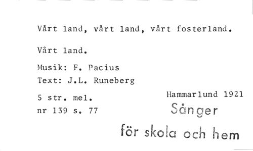 //// Vårt land, vårt land, vårt fosterland. //// Vart land. //// Musik: F. Pacius Text: J.L. Runeberg //// 5 str. mel. Hammarlund 1921 //// nr 139 s. 77 SéflQer //// for skola och h //// em
