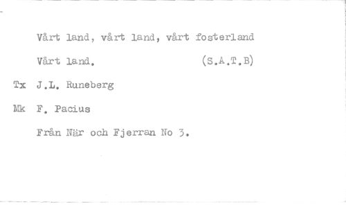 //// Vårt land, vårt land, vårt fosterland //// Vårt land. (S.A.T.B) //// Tx J.L. Runeberg Mk F, Pacius //// Från När och Fjerran No 3.