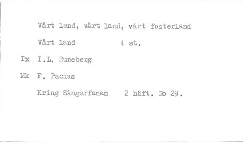 //// Vårt land, vårt land, vårt fosterland //// Vårt land 4 st . //// Tx I.L. Runeberg Mk F. Pacius //// Kring Sångarfanan 2 häft. No 29.