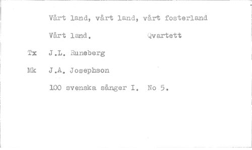 //// Vårt land, vårt land, vårt fosterland Vårt land. Qvartett //// ! Tx J.L. Runeberg //// Mk J.A. Josephson //// 100 svenska sånger I. No 5. //// !