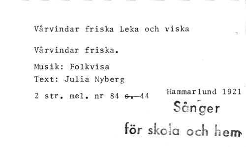 //// Vårvindar friska Leka och viska //// Vårvindar friska. //// Musik: Folkvisa Text: Julia Nyberg //// - ^ i ^ Hammarlund //// 2 str. mel. nr 84 e-r—44 //// Sånger //// för skoia och h //// 1921 //// enr^