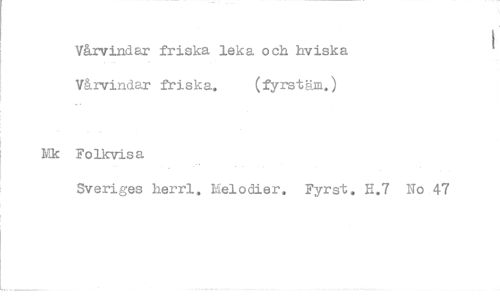 //// Vårvindar friska leka och hviska Vårvindar friska. (fyrstäm,) //// j Mk Folkvisa //// ! //// Sveriges herrl. Melodier. Fyrst. H.7 No 47