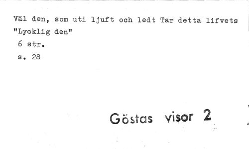 //// Väl den, som uti ljuft och ledt Tar detta lifvets "Lycklig den" //// 6 str. s. 28 //// Göstas visor 2
