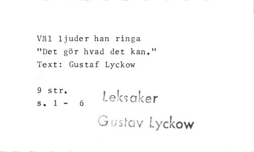 //// Väl ljuder han ringa "Det gör hvad det kan." Text: Gustaf Lyckow //// 9 str. , { , //// s. i - 6 Leksaker //// G us'av Lyckow