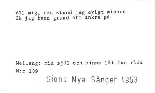 //// Val mig, den stund jag evigt minnes Då jag fann grund att ankra på //// Mel.ang: min själ och sinne låt Gud råda N:r 109 //// Sions Nya Sånger 1853