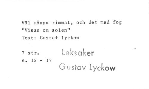 //// Väl många rimmat, och det med fog "Visan om solen" //// Text: Gustaf lyckow //// 7 str. Leksaker //// s. 15 - 17 //// Gustav Lyckow