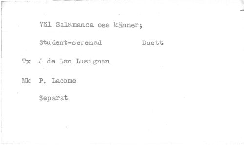 //// Väl Salamanca oss känner Stu dent-serenad Tx J de Lan Lusignan //// Mk P. Lacome Separat //// Duett