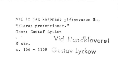 //// Väl är jag knappast giftasvuxen än, "Klaras pretentioner." //// Text: Gustaf Lyckow //// V?e' Hcnc^fcverel //// 9 str. //// s. 166 - 1169 ^Ls!av Lyckow