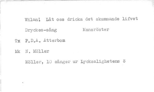 //// VälanL Låt oss dricka det skummande lifvet Dryckes-sång Mansröster //// Tx P.D.A. Att erbom Mk N. Möller //// Möller, 10 sånger ur Lycksalighetens ö