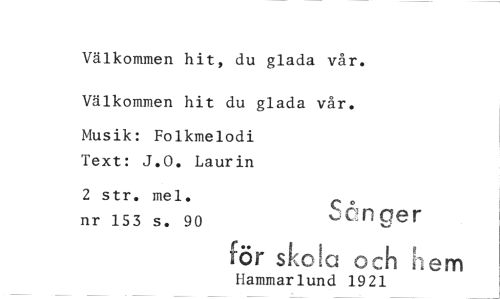 //// Välkommen hit, du glada vår. //// Välkommen hit du glada vår. //// Musik: Folkmelodi Text: J.O. Laurin //// 2 str. mel. //// nr 153 s. 90 ^ODCer //// för sko!a och ii //// Hammar lund 19 21 //// em