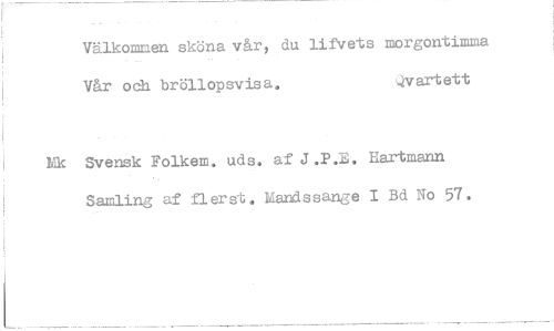 //// Välkomnen sköna vår, du lifvets morgontimma Vår och bröllopsvisa. Qvartett //// Svensk Folkem. uds. af J.F.E. Eartmann Samling af fl er st. Mands sange I Bd No 57.