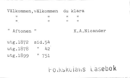 //// Välkommen,välkommen du klara " t! tt tt tt tt t! tt //// " Aftonen " //// utg.1872 sid.54 utg.1878 " 42 utg.1899 " 751 //// K.A.Nicander //// Läsebok