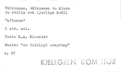 //// Välkommen, välkommen du klara //// du stilla och ljuvliga kväll //// "Aftonen" //// 5 str. mel. //// Text: K.A. Nicander //// Musik: "av folkligt ursprung" //// s. 87 //// KJELLGP.L
