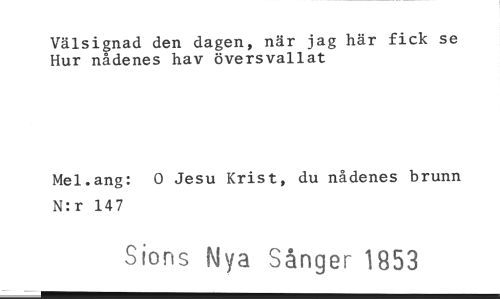//// Välsignad den dagen, när jag här fick se //// Hur nådenes hav översvallat //// Mel.ang: 0 Jesu Krist, du nådenes brunn N:r 147 //// Sions Nya Sånger 1853