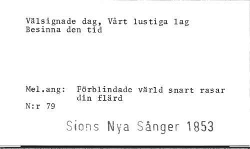 //// Välsignade dag, Vårt lustiga lag Besinna den tid //// Mel.ang: Förblindade värld snart rasar din flärd //// N:r 79 //// Sicrts Nya Sånger 1853