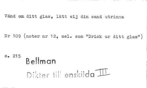 //// Vänd. ann ditt glas, lätt eij din sand utrinna //// Nr 109 (noter nr 12:, mel. som "Drick ur ditt glas") //// s.. 215 ,, //// Bettman //// Dikter ti!* enski!dalID--
