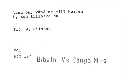 //// Vänd om, vänd om till Herren O, kom tillbaka du //// Tx: A. Nilsson Mel //// N:r 197 //// Bibeitr Vs Sångb Mu$