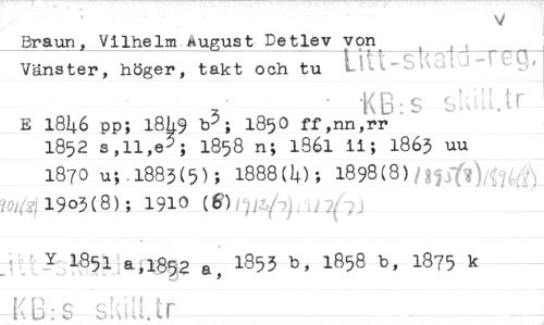 //// V //// Braun, Vilhelm August Detlev von , , , //// ---*--&--—F-1.-- ! -rr^ //// Vänster, höger, takt och tu //// , KB:S s! -Ltr //// E 18^6 pp; 18^9 M; 185O ff,nn,rr //// 1852 s,ll,e3; 1858 n; 1861 ii; 1863 uu //// 1870 u; 1883(5); 1888(4); i898(8)/^^\f^^^.A 1903(8); 1910 (61 //// ! Y 1851 a,1852 a, 1853 b, 1858 b, 1875 k //// i^B:S skia.tr