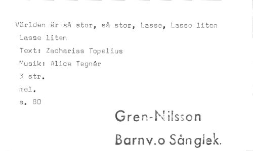 //// Världen är så stor, så stor, Lasss, Lasse liten Lasse liten //// Text: Zacharias Topelius Musik: Alice Tegnér 3 str. mel. s. BO //// Gren-N i!sson Barrtv.o Sångisk.