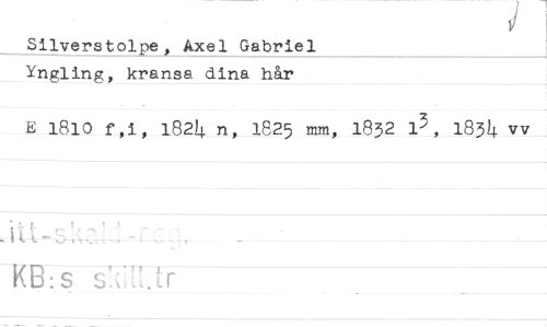 //// Silverstolpe, Axel Gabriel Yngling, kransa dina hår //// E 1810 f,i, 182^ n, 1825 mm, 1832 1^, 183!; //// ^ ^ " ... //// KB:S