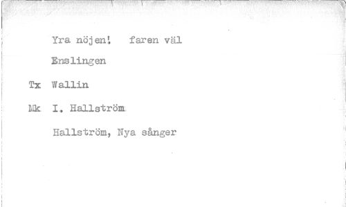 //// ---r— ^ - r " ' "T //// Yra nöj en i faren väl Enslingen //// Tx Wallin //// Nk I. Hallström //// Hallström, Nya sånger