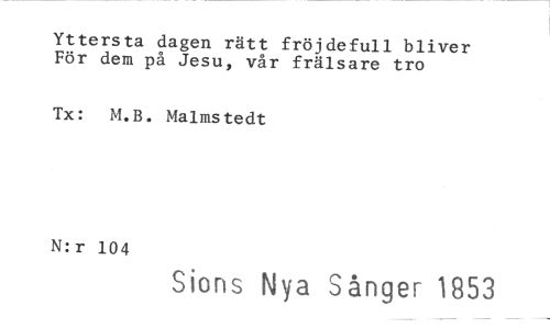 //// Yttersta dagen rätt fröjdefull bliver För dem på Jesu, vår frälsare tro //// Tx: M.B. Malmstedt //// N:r 104 //// Sions Nya Sånger 1853