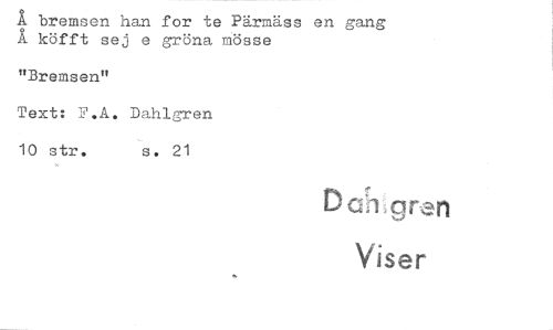 //// Å bremsen han for te Pärmäss en gang Å köfft sej e gröna mösse //// "Bremsen" //// Text: F.A. Dahlgren 10 str. s. 21 //// Darhgna //// Viser