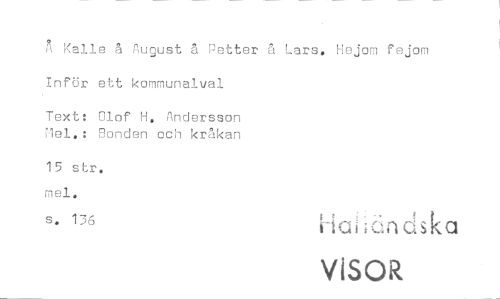 //// R Kalle å August å Petter å Lars, Hejom fejom //// Inför ett kommunalval //// Text: Olof H, Andersson 'lel. : Bonden och kråkan //// 15 sbr. mel. //// s. 136 //// ViSOR