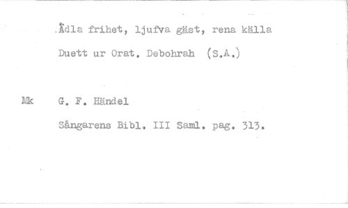 //// .Xdla frihet, ljufva gäst, rena källa Duett ur Orat, Debohrah (S.A,) //// G. F. Händel //// Sångarens Bibi. 111 Sami. pag, 313.