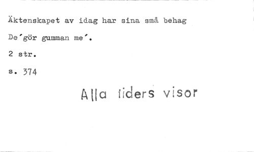 //// Äktenskapet av idag har sina små behag De'gör gumman me'. //// 2 str. //// s. 374 //// A}la tiders visor