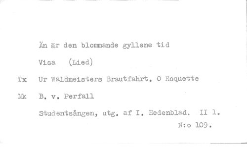 //// Än är den blommande gyllene tid //// Visa (Lied) //// Tx Ur Y^aldmeisters Brautfahrt. 0 Roquette //// Mk B. v. Perfall //// Studentsången, utg, af I, Eedenblad. II 1. //// N:o 109*