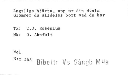 //// Ängsliga hjärta, upp ur din dvala Glömmer du alldeles bort vad du har //// Tx: C.O. Rosenius Mk: 0. Ahnfelt //// Mel //// "s Bibeitr Vs Sangb Mu