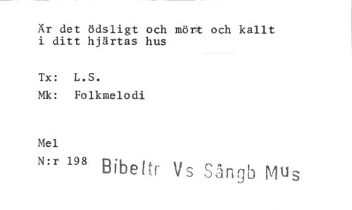 //// Ar det ödsligt och mört och kallt i ditt hjärtas hus //// Tx: L.S. //// Mk: Folkmelodi //// Mel //// Bibeftr Vs Sångb Mu