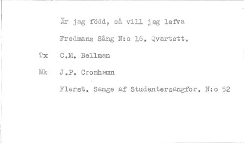 //// Xr jag född, så vill jag lefva Fredmans Sång N:o 16. Qvartett, //// Tx C.M. Bellman Hk J.P. Cronhamn //// Flerst. Sange af Studentersangfor, N:o 52