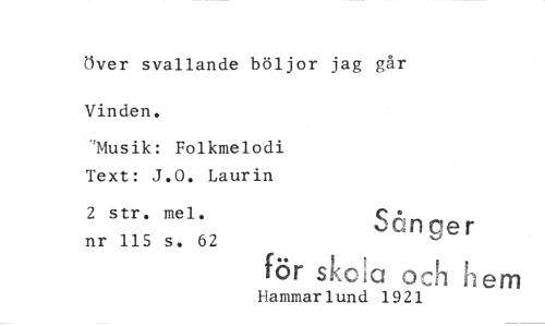//// Over svallande böljor jag går //// Vinden. //// Musik: Folkmelodi Text: J.O. Laurin //// 2 str. mel. q* //// nr 115 s. 62 //// för sia //// sKcta o-( //// Hammarlund 1921