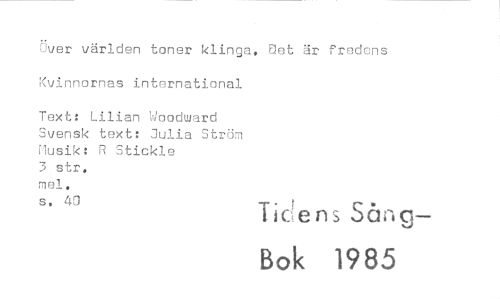 //// Över världen toner klinga, Set är fredens //// Kvinnornas international //// Text: Lilian Woodmard Svensk text: 3ulia Ström Musik: R Stickle 3 str. mel. //// S, 43 -t*- ! r* //// heiens oaa //// Bok 15*85
