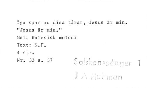 //// Öga spar nu dina tårar, Jesus är min. "Jesus är min." //// Mel: Walesisk melodi Text: N.F.