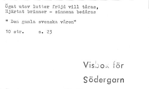 //// Ögat utav lutter frojd vill tåras, Hjärtat brinner - sinnena bedåras //// " Den gamla svenska våren" //// 10 str. s. 23 //// Visbo //// f.. //// ror //// Södergarn