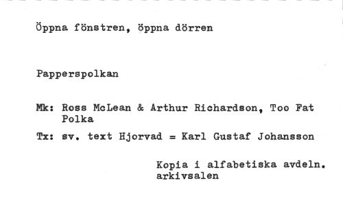 //// Öppna fönstren, öppna dörren Papperspolkan //// Mk: Ross MoLean & Arthur Richardson, Too Fat Polka //// Tx: sv. text Hjorvad = Karl Gustaf Johansson //// Kopia i alfabetiska avdeln. arkivsalen