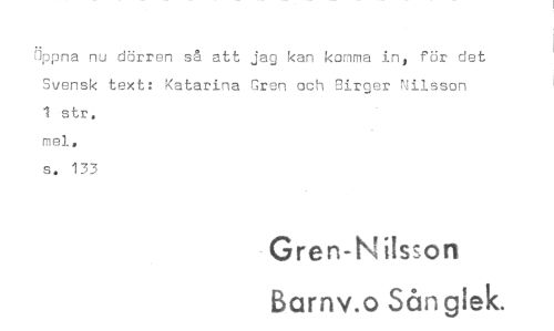 //// Öppna nu dörren så att jag kan kamma in, for det Svensk text: Katarina Gren och Birger Nilsson 1 str, mel, s. 133 //// Grert-Ni!sson Barnv.o Sångiek.