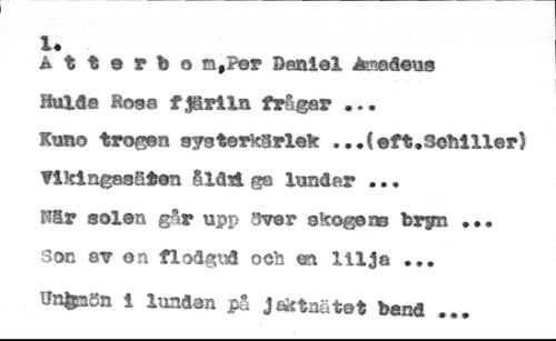 //// % t © r fe o ©,P©r Daniel inedens Hulda Bosa f jgriln frågar ... //// Kuno trogen aystarksrielc ...{eft.Schiller} Yiklngas&ten Aid'd ge lundar ... f*Sr solan går upp svar skogans trim ... son ©v on flodgud och m lilja ... //// UnfesSn i lundar* på Jefrtnatot band ...