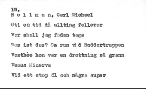 15. //// B o 1 1 @ a n, Carl Miofceel //// Uti ea ii<3 åu allting falleror //// Var skall 3ag t iden tega //// Was ist a oa? G« ran vt å Roddertrappan //// Yastbée hon ver en drottning så grann //// Veaus Minerva //// Vid ett stop öl och nå gro super