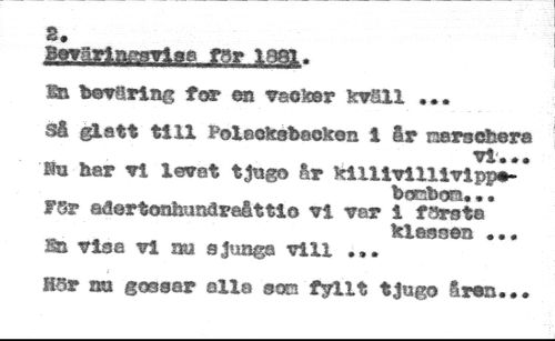 t. //// Bgy_ä3daggTias för 1881. //// Wr bevnring for en vacker kväll ... //// Så glatt till Polecksbecken % år narscfcera //// 8c her vi levat tjugo år killivillivippi^* //// „ barbon.. • //// F8r edertonfcunäraåtti© vi ver i förste //// klassen ... //// Sa vise vi m sjunga vill ... //// Hör tm gassar sila son fyllt tjugo åren...