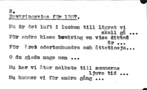 Bov^rtarsvt^a f •» 1^?. //// lm 8r let luft 1 luokan till lägret vi //// skall gå //// För endre klees b*v?ring er» vise dikted //// är • • • //// För året adertonhundra ooh åttetioeju. //// 0 du gled© unge nan ••• //// Nu har vi åtor nalkats till «omsms //// ljuve tid ... //// Ku koraner vl för enöra gång //// • • *