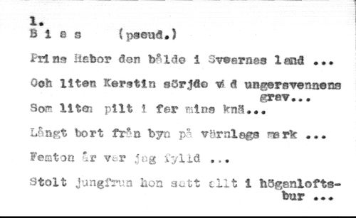 1. //// B 1 b s {pseud.i //// £tlns Bebor don i ivesrnas lenå ••• //// Ooh liten Kerstin sör.lfla yl å ungersvennens //// greir •«• //// Som 11 tei plit 1 fer mins *rn3 • • • //// Långt hort fr*n byn på värnlegs merk ... //// Fest cm år var Jag fylld .,. //// Stolt jungfrun Lon autt ellt 1 högenlofts- //// bur //// • • ?
