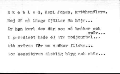 I k © b 1 » d, Kerl .Jñhtm, k^tth^nâl^re» //// K# J ån s* ISnge fjallrr §n h''Jr... //// Ir han k^rl den d§r son «â fer*krr ©eh //// a*9r.,* //// I prrr Siset hrde e„t Srr ''nod.lournrX.,. //// Att «wñvne för en vôker flicke.•• //// So® sens!tivn älsklig blyg och skftr,..