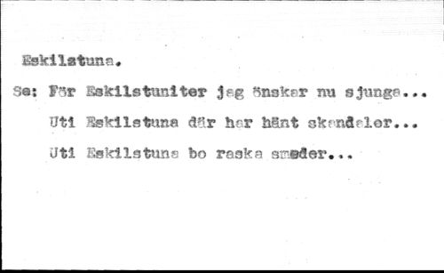 Eskilstuna. //// Sa; T5ï* Sskils timi ter jag knakrr nu s junge Uti Stokilstuns dör har hSnt skr&ârler. Uti Eskilstuna bo raska aTJsåev, ».